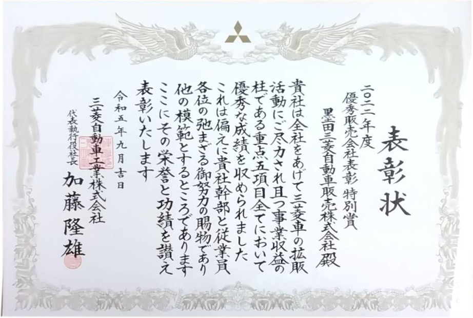 この度、皆様のご愛顧により、2022年度 三菱自動車優秀販売会社特別賞を三菱自動車工業社長より、受賞いたしました。