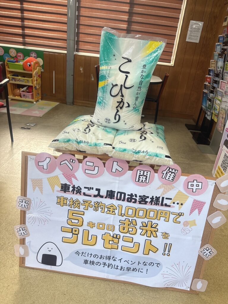 イベント開催中! 2025-07-25 最終更新日時 : 2026-01-26 東松戸店業平自動車 現在、松戸店では車検入庫時に 予約金1100円(税込み)をお支払い頂くと お米5キロプレゼント! 気になる方はお早めにご来店お待ちしております^^ Follow me!