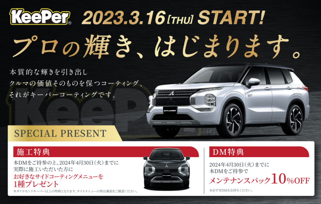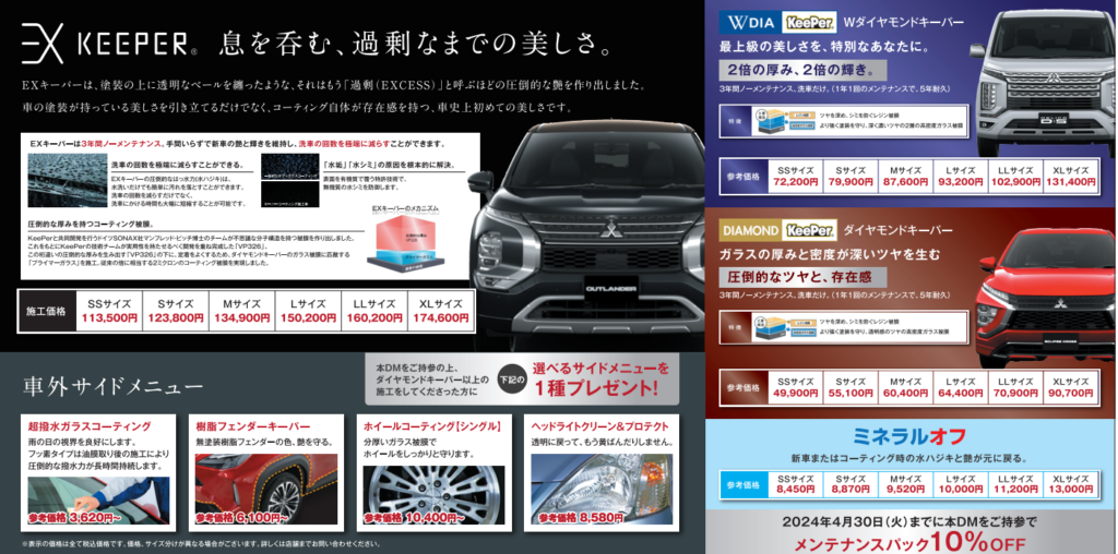 ネットからの問合せで、ダイヤモンドキーパー以上の施工をされた方へ、「選べるサイドメニュー」プレゼント。更に、「メンテナンスパック10%オフ」キャンペーン。ナリヒラ自動車グループでキーパー施工が始まります。詳しくは、お気軽にお問い合わせください。