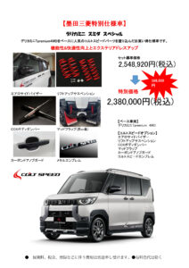 【コルトスピード】デリカミニ スミダスペシャル【コラボ】 2026年1月12日 最終更新日時 : 2026年1月26日 narihira あのコルトスピードとコラボしたデリカミニが初登場!個性的なオプションで、注目の的になること間違いなし! ※この車両は販売を終了いたしました。 あのコルトスピードとコラボしたデリカミニが初登場!個性的なオプションで、注目の的になること間違いなし! 墨田三菱オリジナル特別仕様車 デリカミニスミダスペシャル セット標準価格 2,548,920円 [税込] 写真はサンプルです 特別価格 2,380,000円(税込み) 特別お値引き! 16万円以上のお値引き! \ 最新情報をチェック / FacebookXBlueskyHatenaCopy